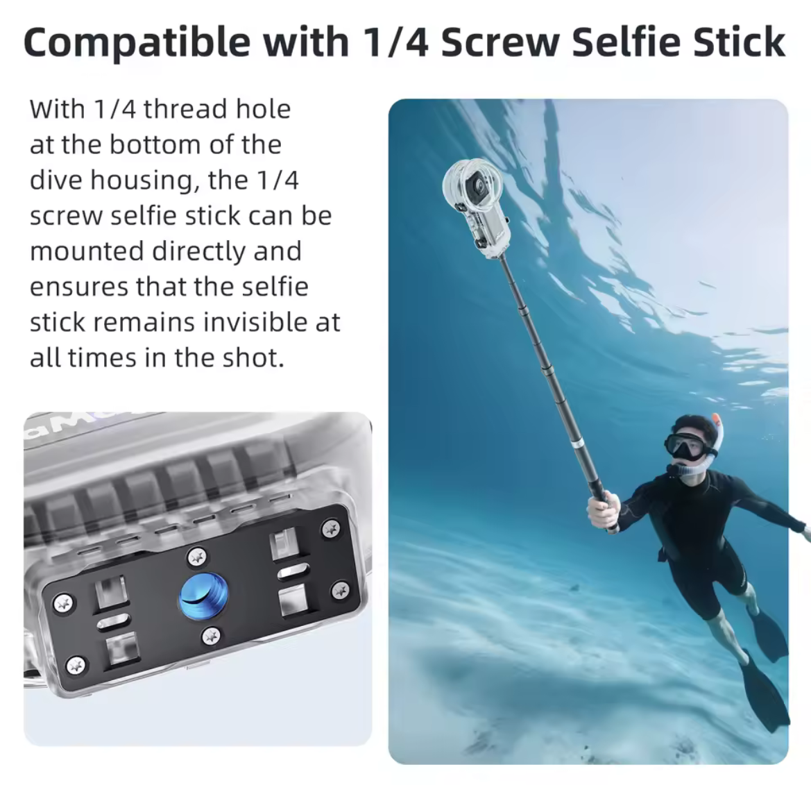 Grâce à la technologie de la caméra Insta360 X5, votre caisson ainsi que la perche deviendront parfaitement invisible lors de vos plongées !